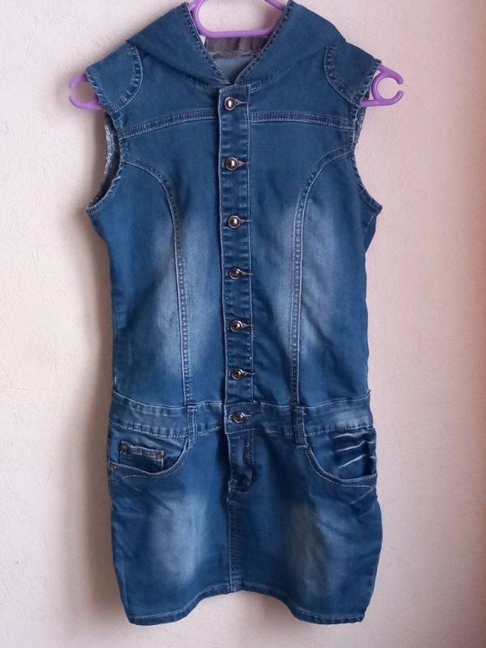 Robe en jean à capuche en très bon état Longueur : 77 cm Mesure aisselle à aisselle : 41 cm Fermeture par boutons et fermeture éclair #14Betty