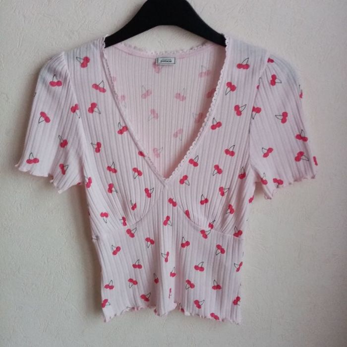 Top motif cerise en très bon état, car très peu porté 50% coton et 50% polyester Taille 38, peut convenir à une personne qui porte du 36