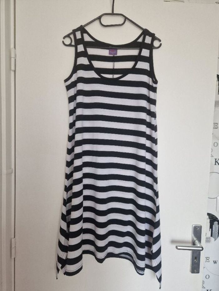 Robe sans manche à rayures noire et blanche, évasée sur le bas et petites fentes sur les côtés. 95% polyester et 5% élasthanne. Taille M mais peu convenir à un L car assez large.