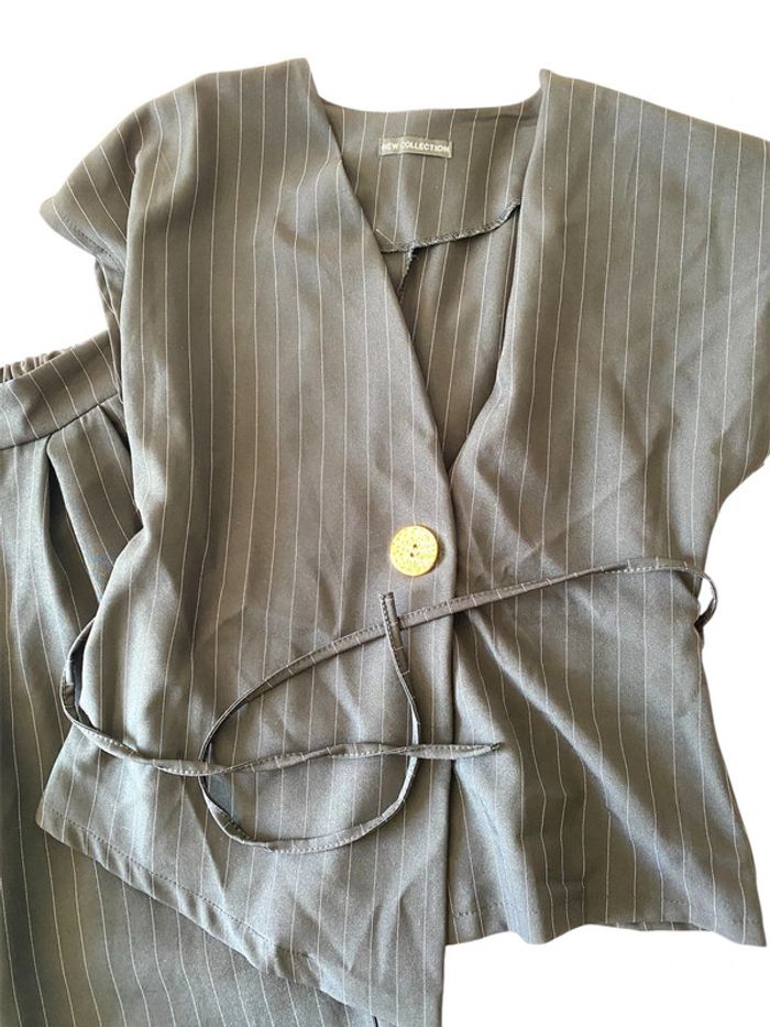 Ensemble blouse croisée avec bouton martelé or et pantalon fluide Noire rayures grises Taille unique Neuf sans étiquette Marque new collection Acheté dans le magasin total fashion mais je n’ai pas gardé le ticket pour pouvoir le ramener #newcollection #ensemblefemme #businesslook #ensembleclasse