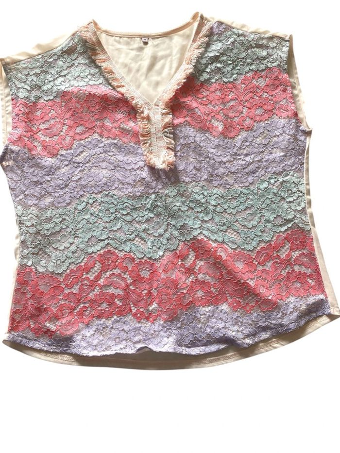 T shirt dentelles et franges couleurs pastelles taille m Tbe ?>