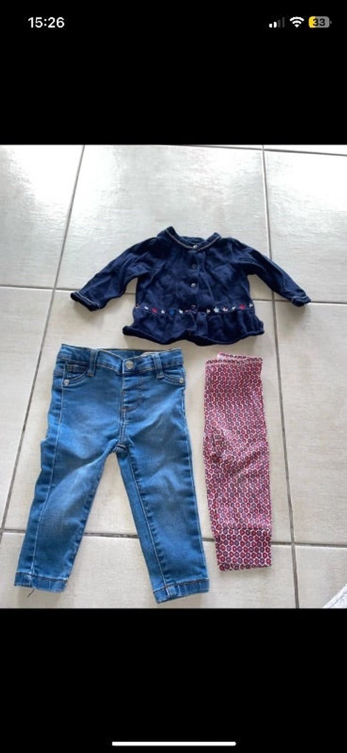 Lot 3 pièces 6/9 mois 1 jeans tbe (léger défaut genou) 1 leggings tbe 1 gilet bon état sergent major