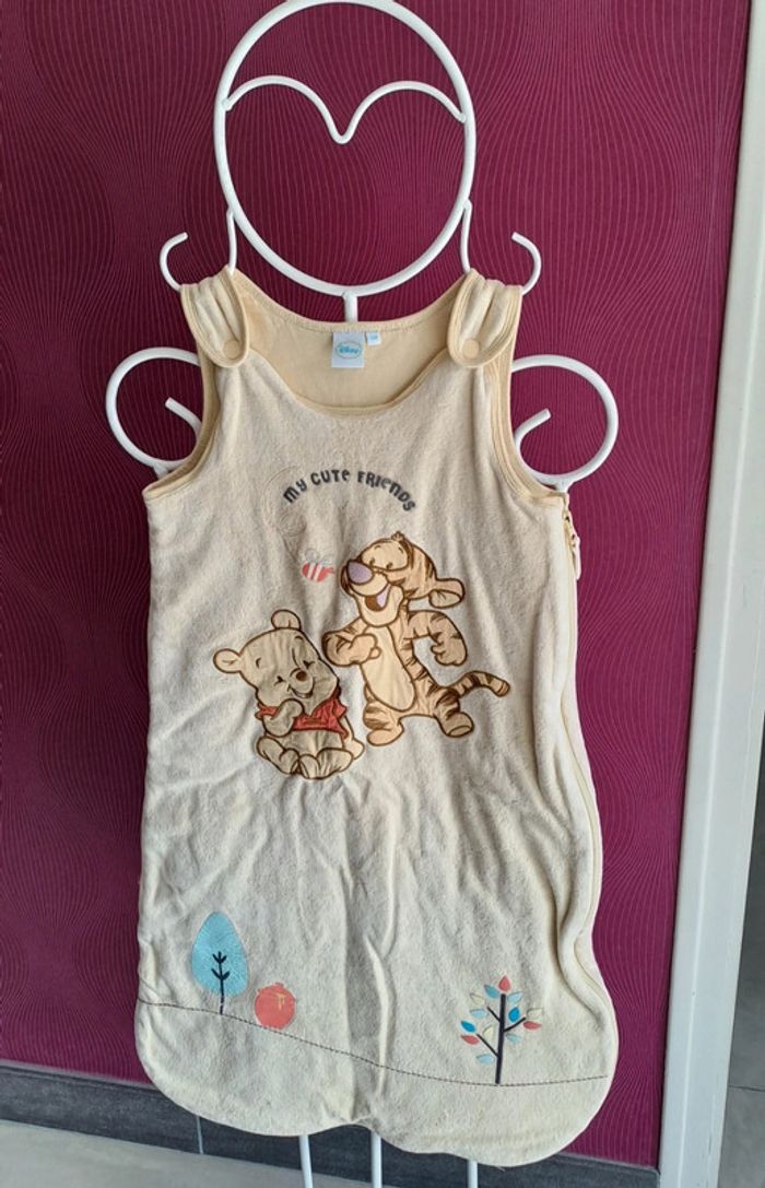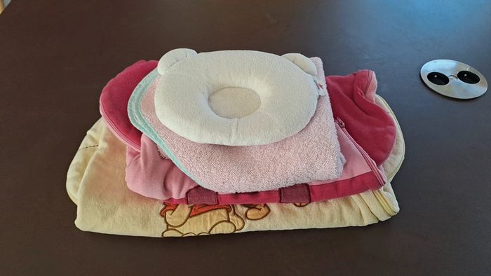 Lot composé d'un cale tête bébé candide, de 2 gigoteuses(la winnie est réglable par pression plus ou moins longue) et d'une cape de bain Bon état