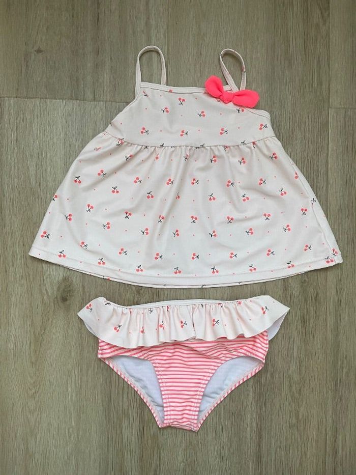 Maillot de bain 2 pièces Kiabi rose avec des cerises en très bon état. Taille 18 mois