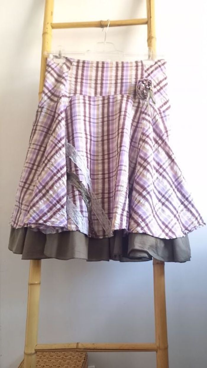 Jupe évasée avec jupon, doublure Coloris : mauve, kaki, marron Carreaux, bandes de dentelle et fleur Fermeture éclair sur le côté 100% coton, tissu texturé, gaufré Parfait état Marque Myose