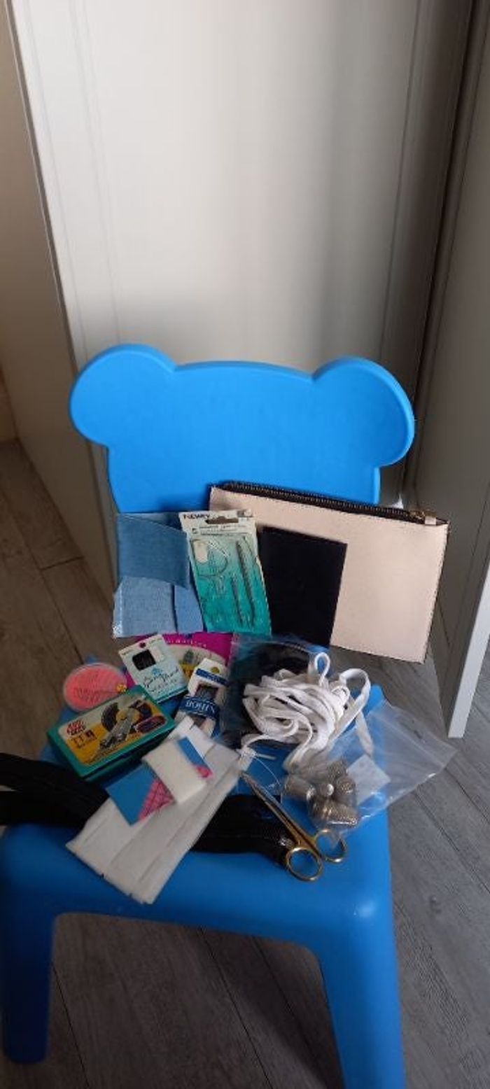 Lot comprenant divers aiguilles deux thermocollants un bleu jean et un noir des lacets blancs de différentes grandeurs une paire de la c'est noir 3 aiguilles à repriser au moins 8 des ,un petit ciseau une fermeture éclair noire une pochette et des thermocollants ourlet facile tout n'est pas neuf mais reste en bon état