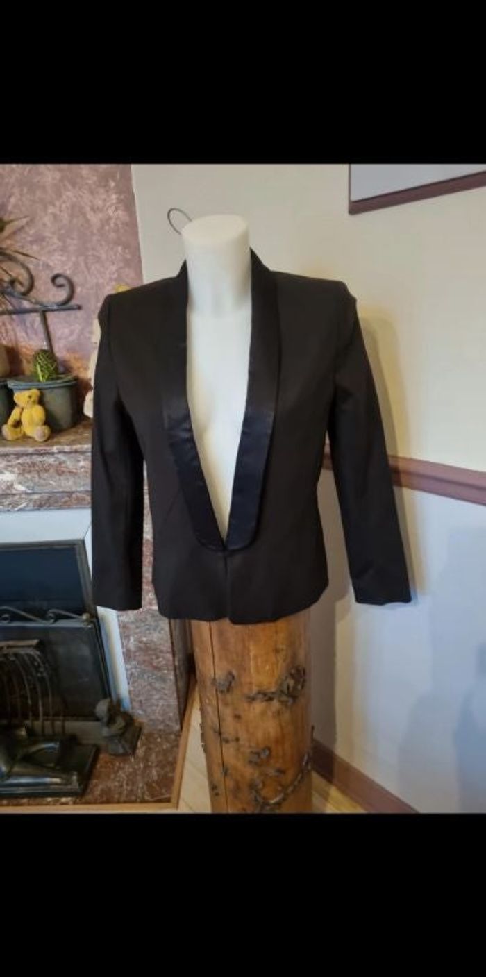 Veste noir coupe smoking 36 h&m, revers col satiné, doublée, cintrage au dos, coton elasthanne, lavable machine à laver 30 degrés. Tenue pour vos fête. Très bon état 🌺 Faites un lot mes réductions sont activées 🌺 Envoi rapide 🌺