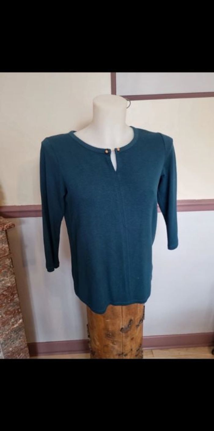taille S sur étiquette mais je dirais 38 40 ou M , manches 3/4,bleu canard,forme ample avec pli d aisance au dos, fermeture de l encolure devant avec une attache métallique façon bijoux, belle qualité. faites votre lot mes réductions sont activées 💐 Très bon état 🌺