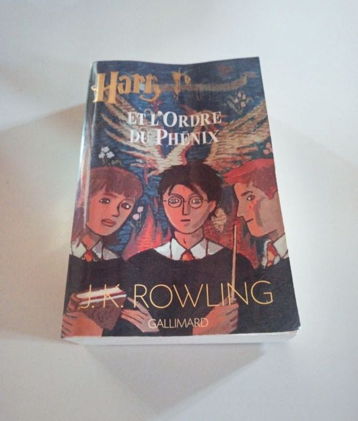 Harry Potter et l'ordre du Phénix Édition Gallimard grand format 976 pages Acheter 28 euros en 2003 Livre ayant du vécu , quelques tâches quand on ouvre le livre , ça change rien à la lecture.