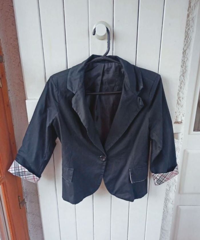 Veste noire avec épaulettes Manches 7/8 , revers imprimé Fausse poches S'attache avec un bouton , fendue au dos Noté taille L sur l'étiquette, c'est un S