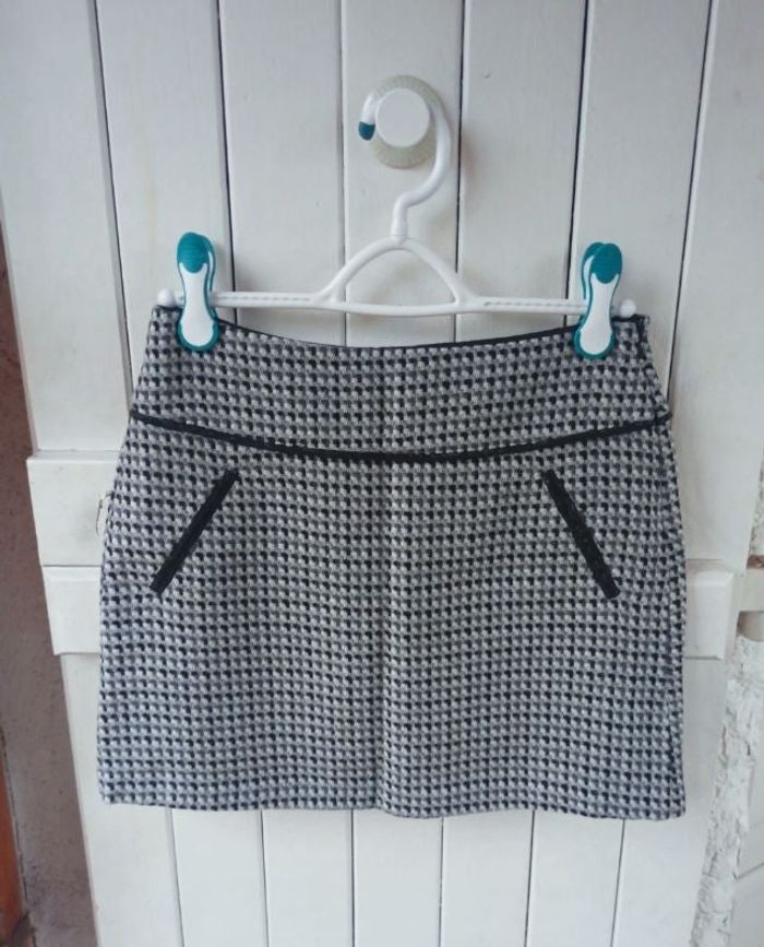 Jupe courte motif chevron taille 36 Fermeture sur le côté Bande de simili abîmé voir photo, acheter tel quel ne se voit pas porté 25 % de laine