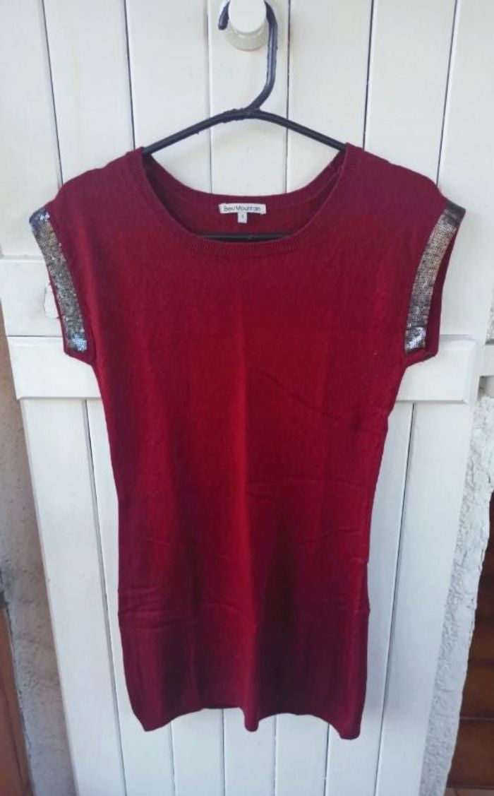 Robe courte bordeaux Sequins aux niveaux des manches Peluche un peu Compo de la matière en dernière photo