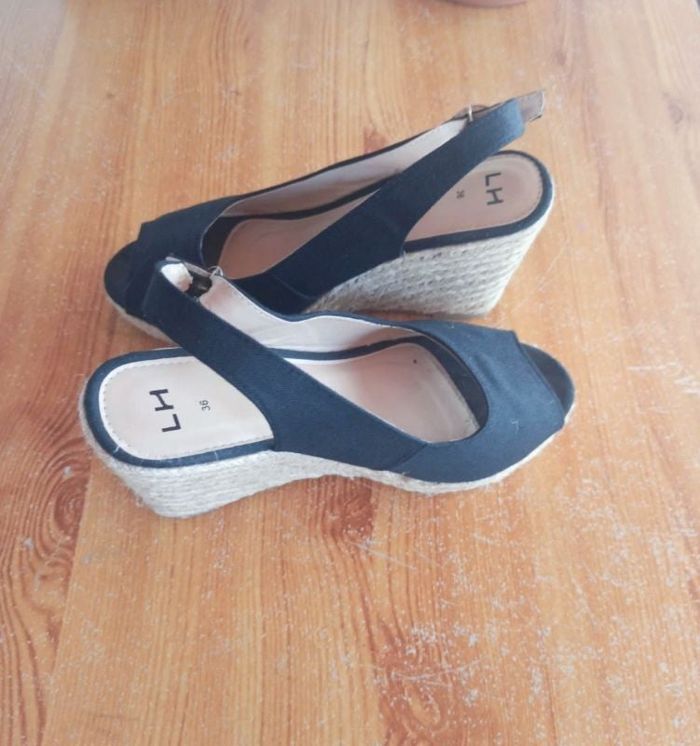 Compensées noir Ouverte devant et au talon (hauteur 9 cm ) Trop haut pour moi