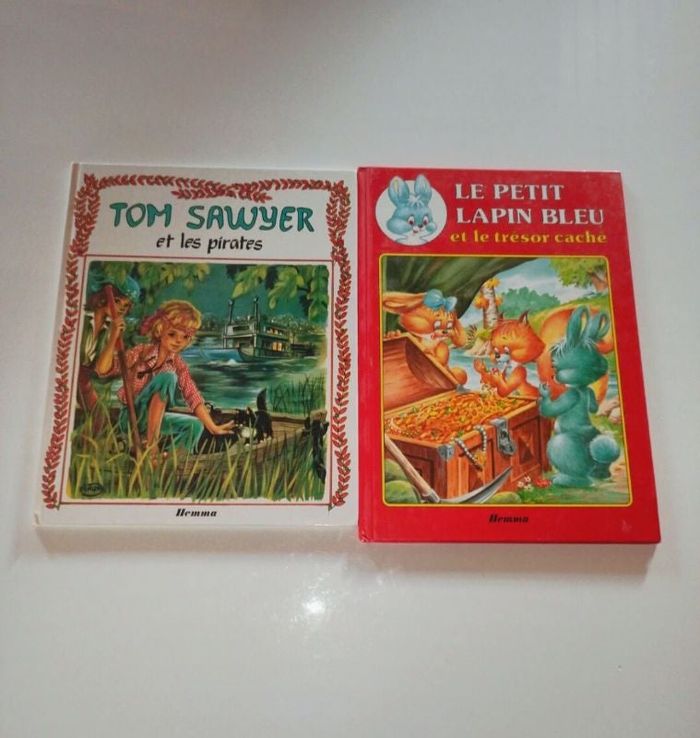 Édition hemma Tom Sawyer et les pirates Le petit lapin bleu et le trésor caché Livres vintage 80 Quelques pages qui se détache sur le livre du lapin bleu et scotch sur le livre Tom Sawyer