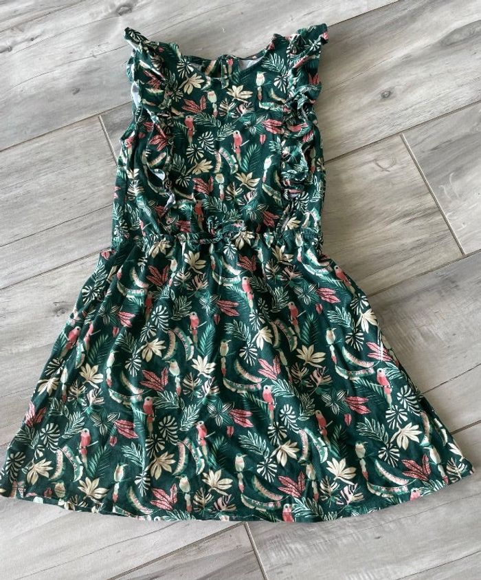 Jolie robe Vert Baudet T 10 ans Couleur vert avec dessins exotiques oiseaux et fleurs colorées Manches courtes volantées Petit noeud à la ceinture élastiquée Très bon état