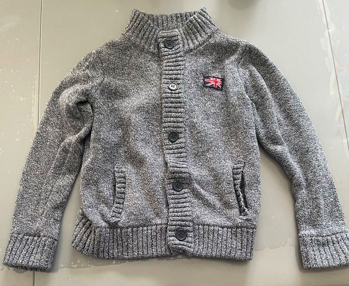 Beau Gilet cardigan garçon T 4 ans Tape à l'œil Couleur gris chiné Fermeture par boutons 2 poches sur le devant Écusson anglais sur le devant Très pratique pour mettre sur un teeshirt ou autre Très bon état ( comme neuf)