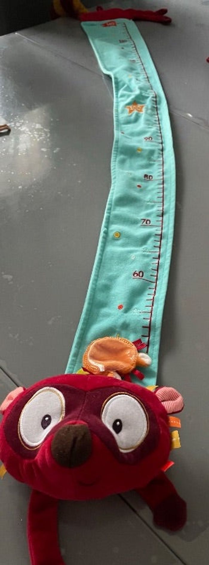 Toise Georges le Lémurien de la marque Lilliputiens! Cette toise mesure la croissance de votre enfant de manière ludique et colorée. Georges le lémurien s'est mis la tête en bas afin de devenir une toise aux couleurs douces qui décorera la chambre de votre enfant tout en vous permettant de le mesurer régulièrement. Avec son design bleu et rouge, elle apportera une touche de gaieté dans la chambre de votre petit. Georges le Lémurien, le personnage emblématique de la marque, est représenté sur la toise pour rendre le suivi de la croissance encore plus amusant. Dimensions : mesure votre enfant jusqu'à 1m40. Hauteur : 1m50 (environ). Très bon état