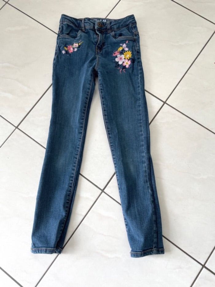 Beau pantalon jean slim T 9 ans Vert Baudet Couleur bleu 2 poches sur le devant avec jolies fleurs colorées en fils Très bon état ( comme neuf car très peu porté)