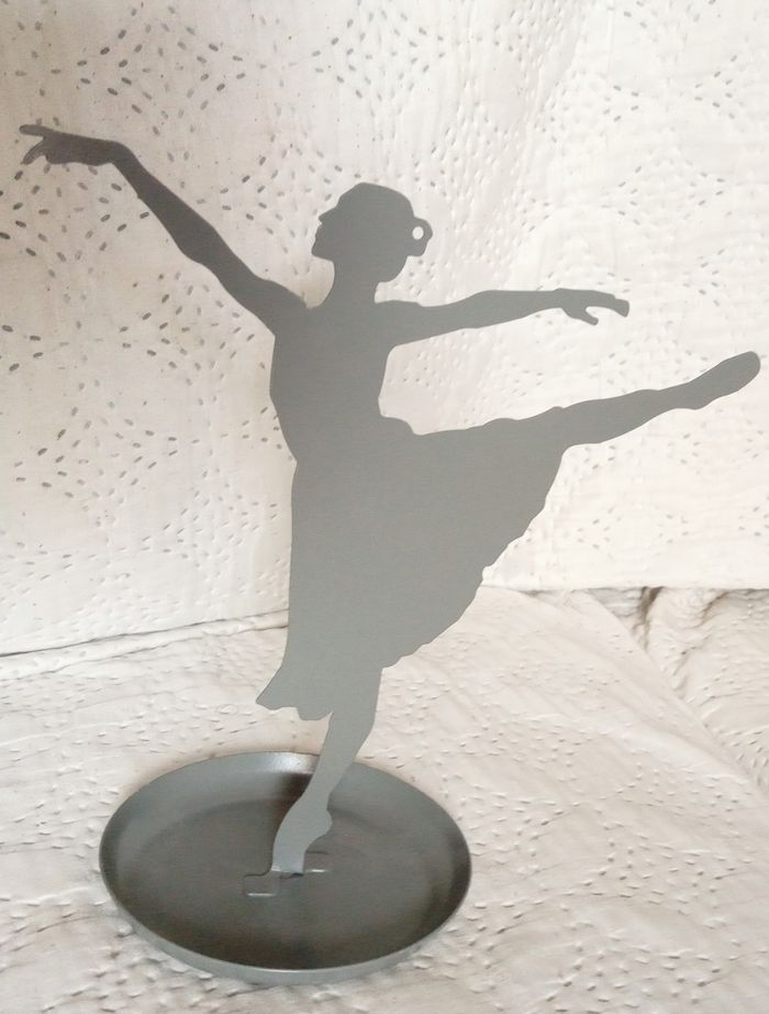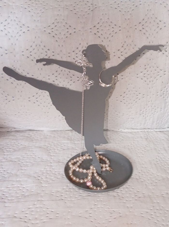 Joli porte bijoux neuf en métal forme de danseuse classique idéal pour accrocher des bijoux sur ses bras ses jambes sa tête peut également mettre sur la coupelle en dessous il est en métal et mesure environ 19 cm de hauteur Payé 14 €