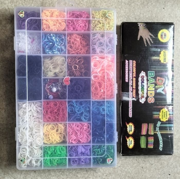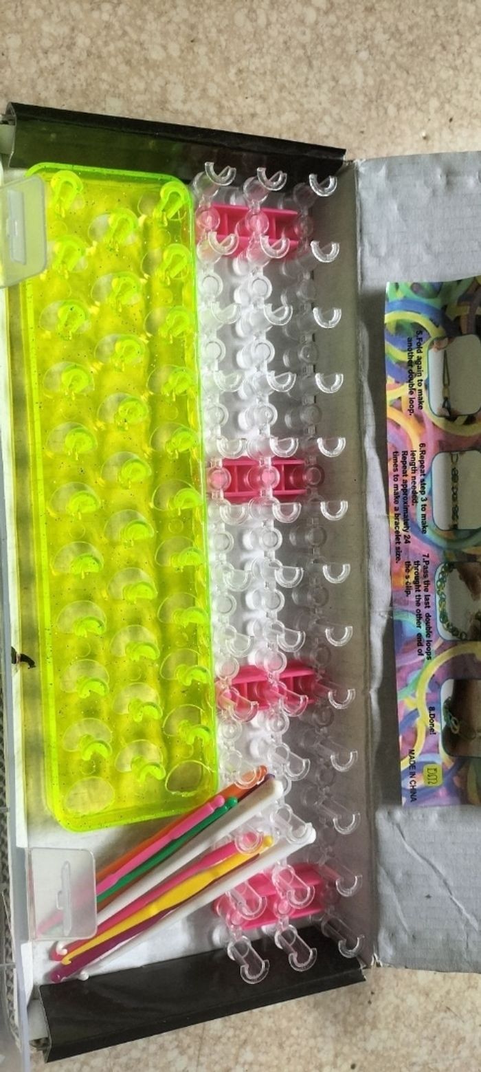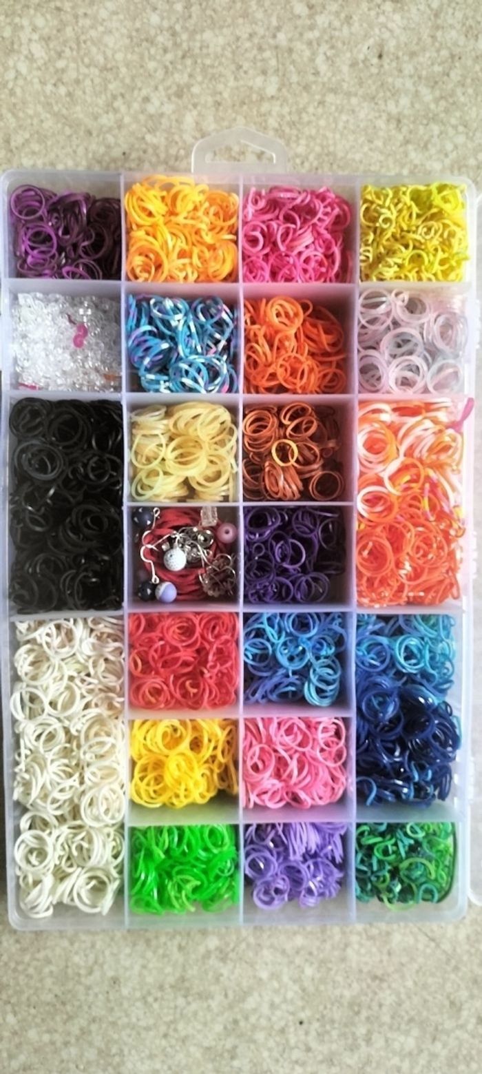Lot kit élastiques pour loisirs créatifs Des milliers d élastiques de toutes les couleurs pour confectionner des bracelets , bagues , colliers etc Valise 35x25 cm Excellent état car très peu servi 20€ ferme