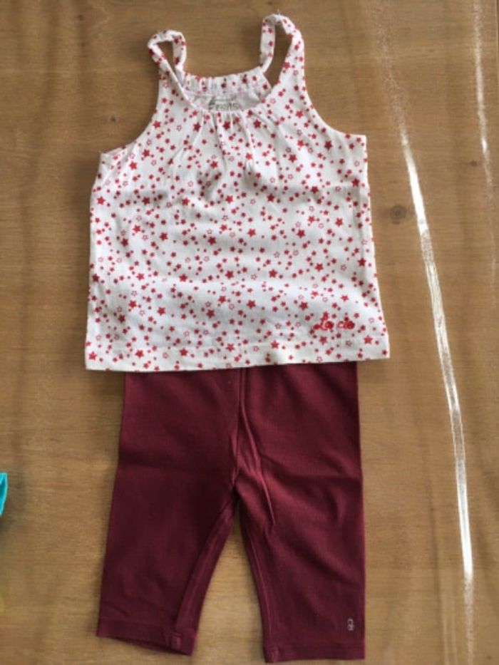 Ensemble débardeur et legging court en très bon état. Le débardeur de marque la compagnie des petits et le legging obaibi. 18 mois.