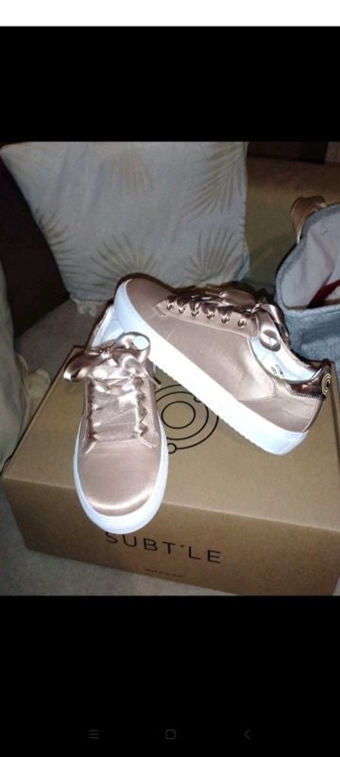 Baskets Delta en satin nude et rose gold avec une paire de lacets supplémentaire rose clair taille 37 neuve encore emballées acheter 140€