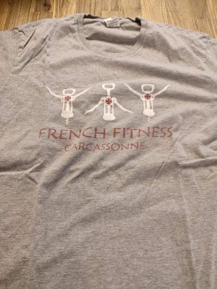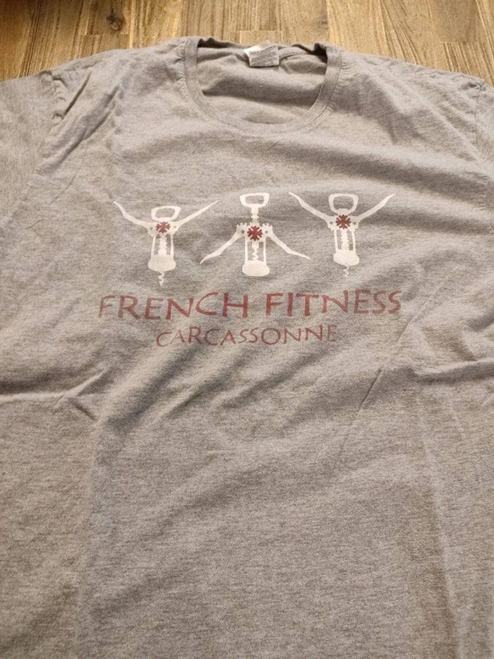 T-shirt imprimé humoristique en XXL acheté à Carcassonne. French fitness représentant des tire-bouchons en pleine action faisant penser à des postures de gymnastique !