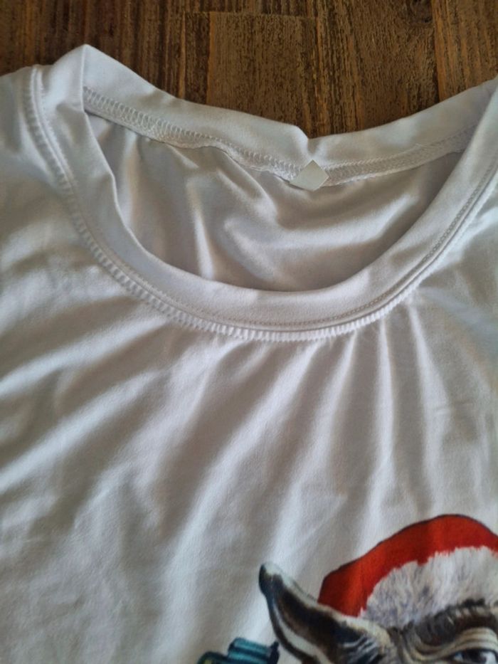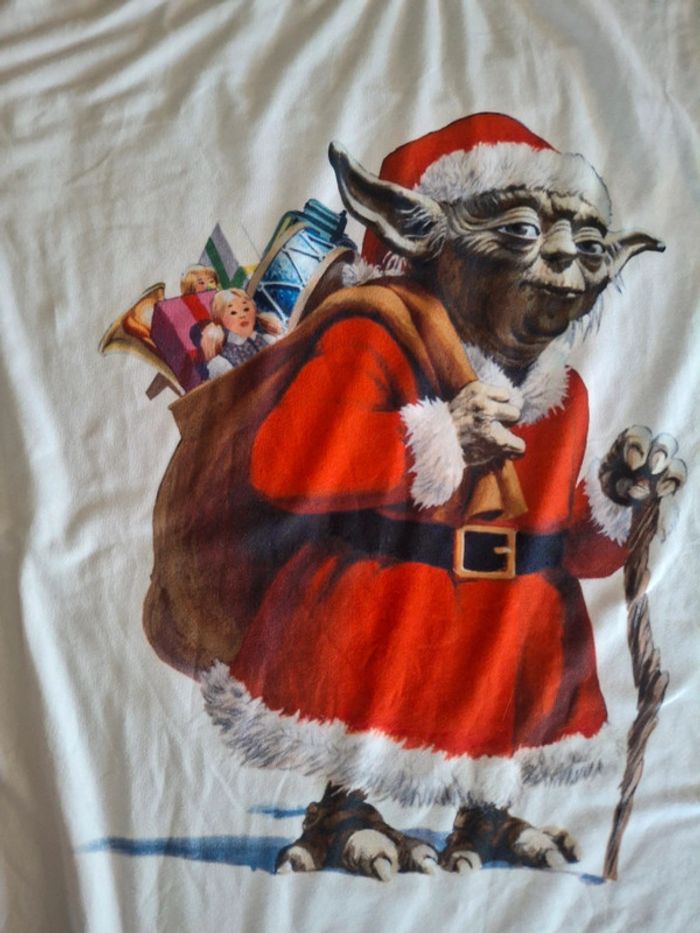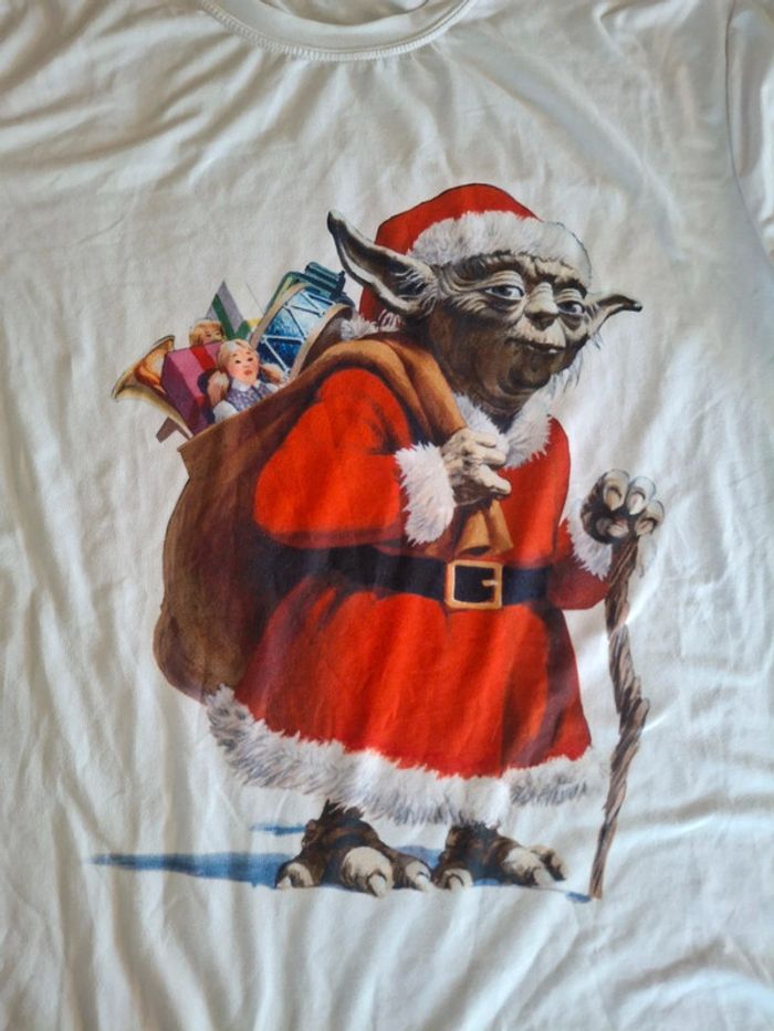 T-shirt de Noël avec un flocage de Maître Yoda déguisé en Père Noël. Il s'agit d'un XL, mais il taille petit donc, j'ai noté taille L.