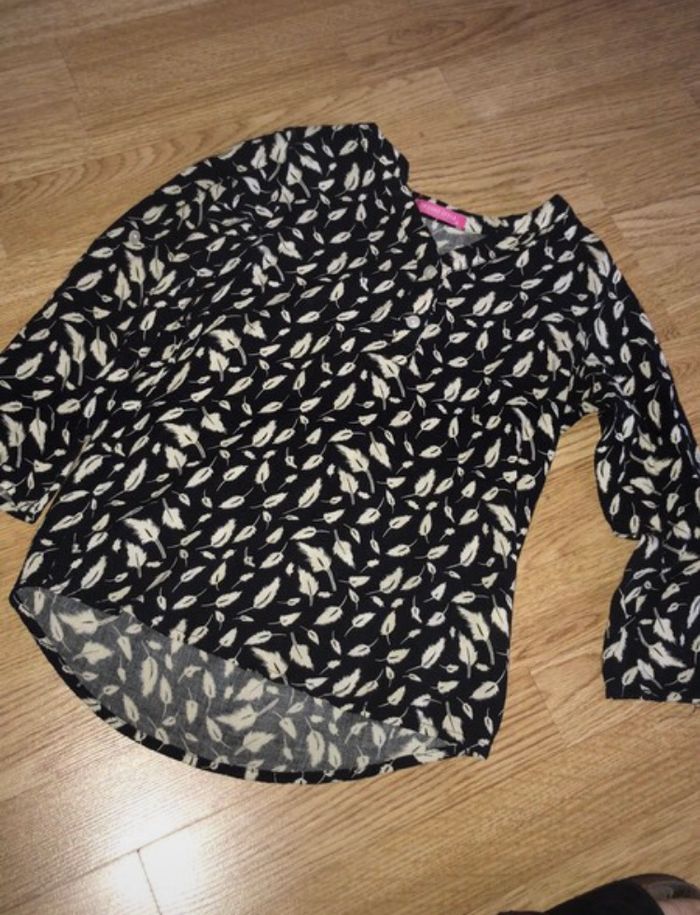 Chemise blouse noir à plumes beige 8 ans, col V ouvert avec fermeture à 2 boutons, manches 7/8eme, marque Trendy style