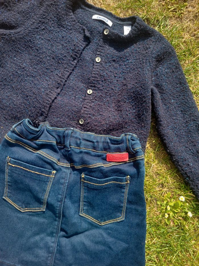 Petite jupe en jean bleu marine et d'un gilet bleu pailleté Okaïdi 5 ans