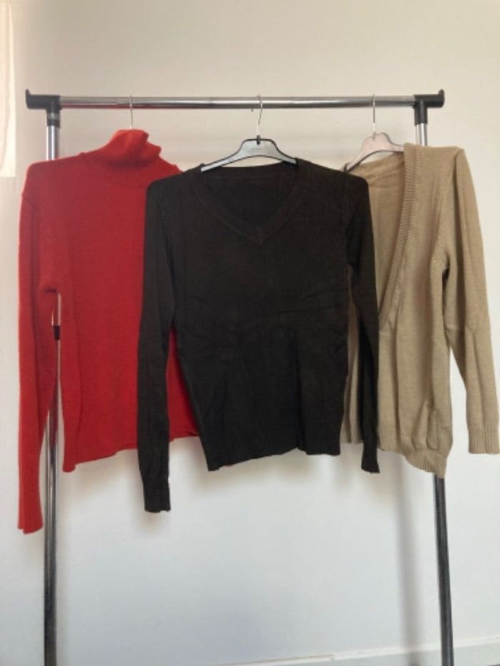 Lot de 3 pulls femme taille L comprenant un pull couleur rouillé à col roulé + pull beige col V + pull marron col V très bon état tous trois