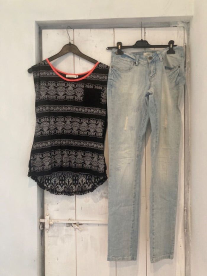 lot comprenant un jean skinny clair taille 36 porté une fois, et un tee shirt bi matière rose/noir effet dentelle taille S/M très bon état