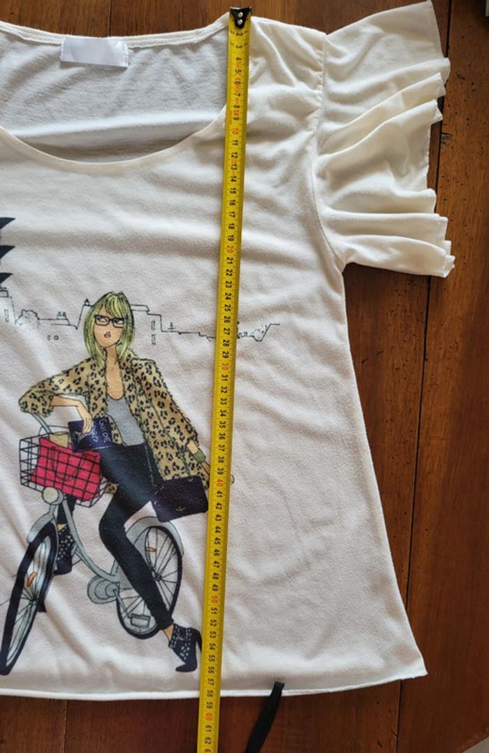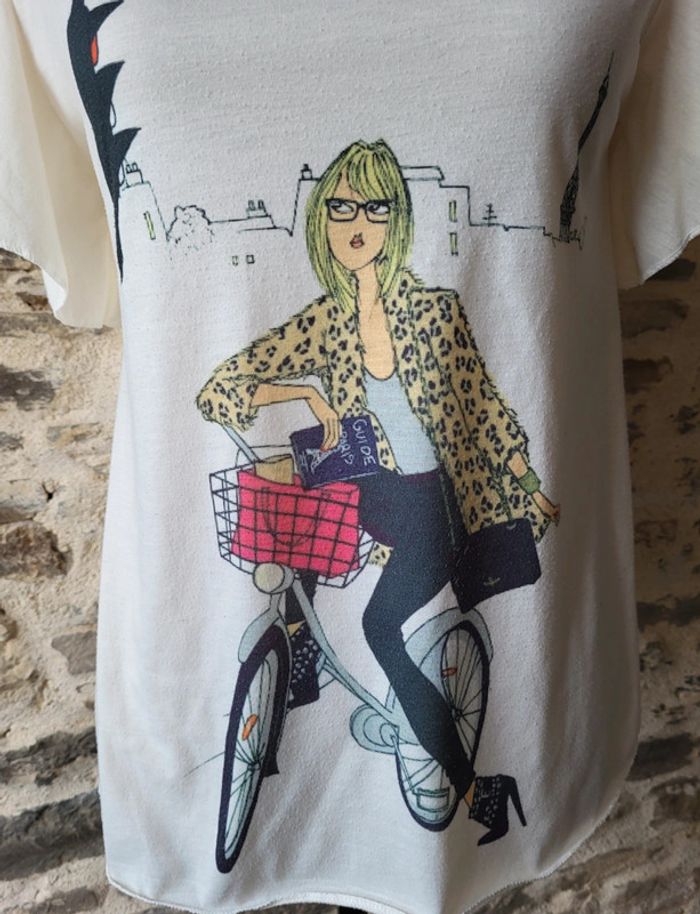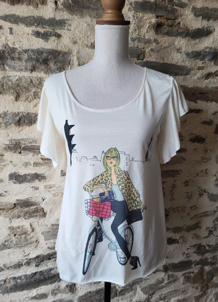 T-shirt manches courtes écru motif parisienne à vélo Taille 34 - photo numéro 1