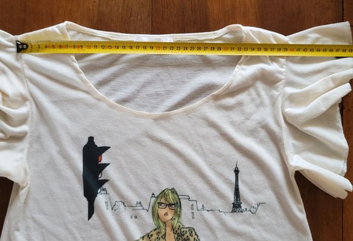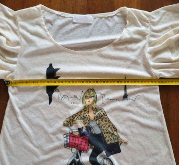 Très joli T-shirt manches courtes volantées écru motif parisienne à vélo Boutique indépendante Taille 34 bien vérifier les mesures ci-dessous et en photos Carrure 39cm Aisselles 44cm Longueur 58cm En viscose Porté quelques fois présente des signes d'usures (micro bouloches) mais à peine visibles dans le tissu clair. Envie de redonner une seconde vie à ce t-shirt très sympa ☺️ #matka27_taille34 #taille34 #tshirt #écru #motifs #parisienne #manchescourtes #été #manchesvolantées #paris #toureiffel