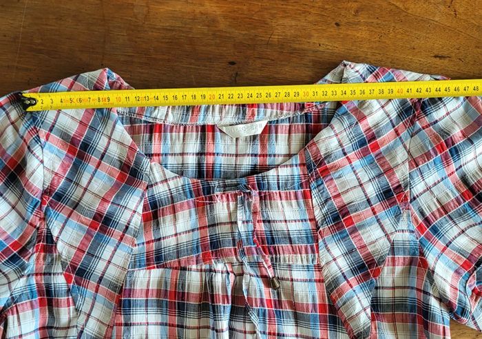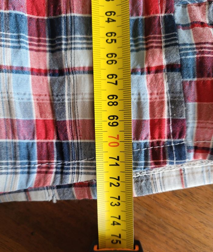 Très jolie blouse manches courtes style tunique à carreaux bleu rouge et blanc 2 poches sur les côtés, fil irisé dans le tissu FD Joseph Taille 3 ou 42 44, bien vérifier les mesures ci-dessous et en photos, selon vos mensurations peut convenir jusqu'à une taille 44 Carrure 43cm Aisselles 58cm Longueur 73cm Légère, fluide et agréable à porter , Mélange de coton, polyester et elastane En très bon état #matka27_taille42 #matka27_taille44 #taille4244 #blouse #bleu #rouge #blanc #manchescourtes #été #carreaux #irisé #fdjoseph