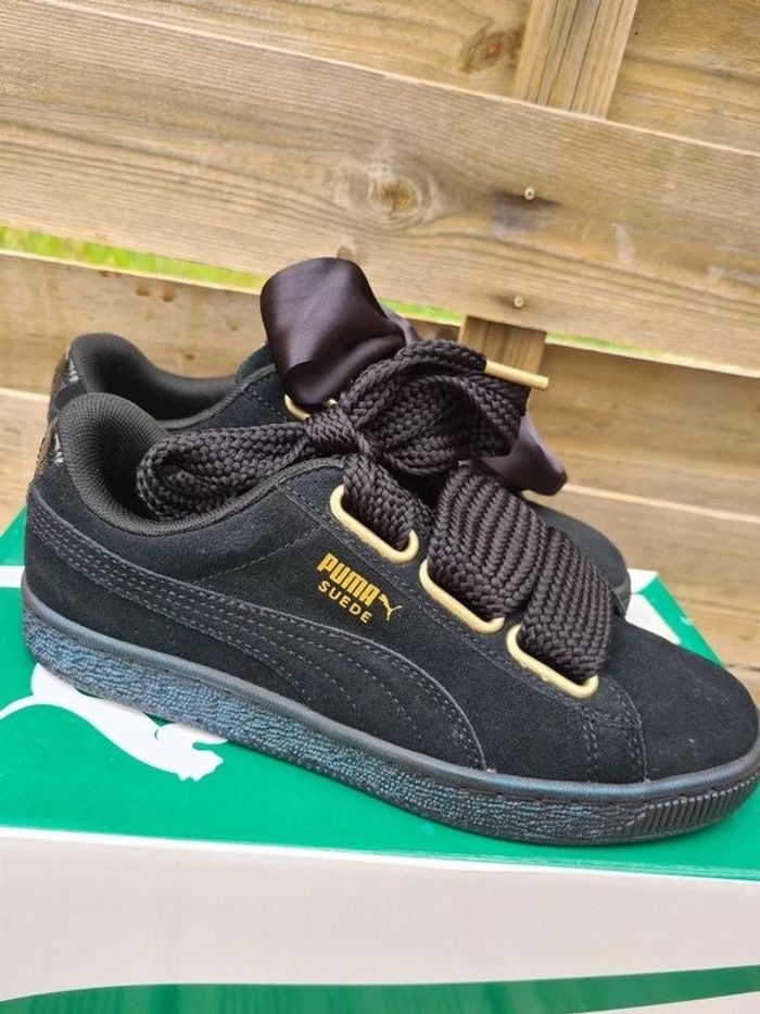 Puma Suede Heart Satin Wn's - pointure 35,5 Modèle emblématique de la marque au félin, la Suede est indémodable Jolie déclinaison fraîchement débarquée dans la gamme Heart. Toujours aussi confortable, elle est idéale pour le quotidien . Style = Baskets, Tennis Tige = Basse Couleur principale = Noire, or et holographique noir/vert à la semelle Neuve jamais portée Vendue dans boîte d'origine Pointure 35,5 convient à un 36.5 Deux paires de lacets comme visibles sur photos