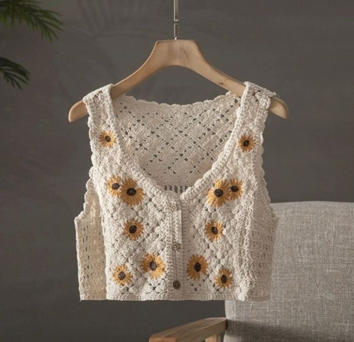 Top court bohème crochet avec fleurs brodées. Il mesure 45 cm de large et 30 cm de long. C'est une taille unique qui conviendrait à un S ou un M.