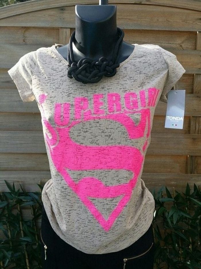 Tee-shirt Super Girl Nude et motifs rose appliqués Taille universelle convient à un S petit M