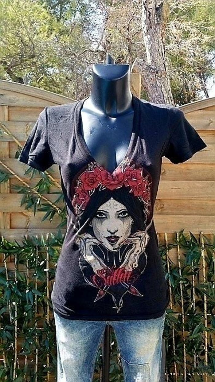 Tee-shirt Sullen Angels gothique pin-up Neuf jamais porté Très joli tee-shirt imprimé gothique vintage pin-up Décolleté en V De chez Sullen Angels