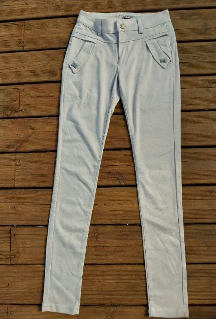Pantalon 6 ème sens taille S Beige rosé Deux poches plaquées latérales et de fictives à l'arrière Détails nœuds cocardes dorées et strass aux poches