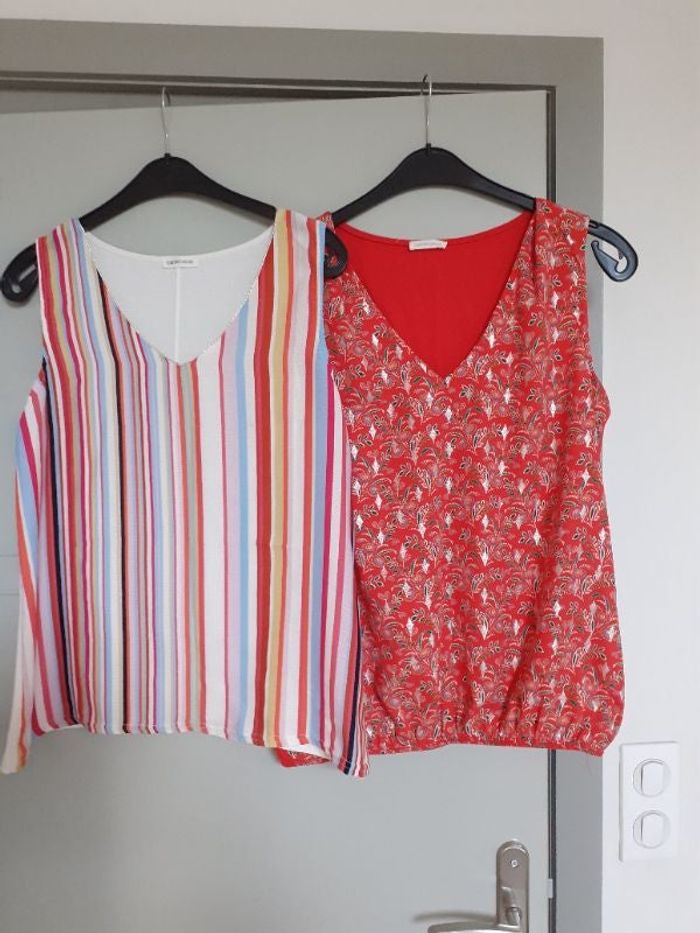 Vends 2 blouses peu portées la orange avec motifs a le dos uni orange et l ecru à rayures a le dos uni écru