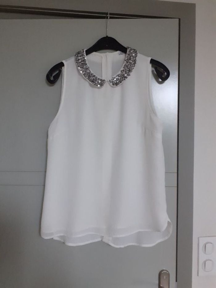 Vends blouse sans manches doublée devant et boutonnée derrière avec col en sequins argentés taille 40/42 couleur écru