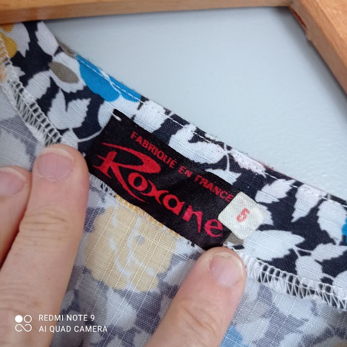 Polyester. Vintage. Made in France. Marque Roxane. Taille estimée. Mesures prises à plat : épaules : 42cm, aisselles : 60cm, longueur : 62cm. Quelques bouloches. C8