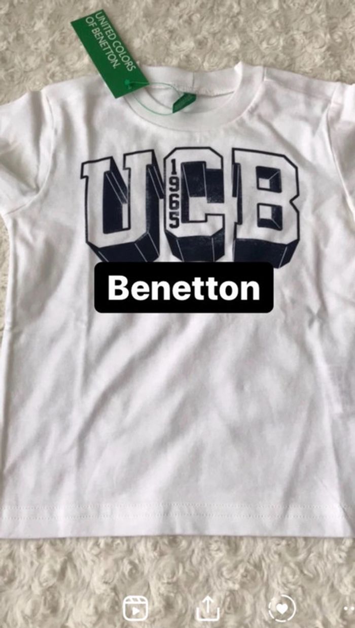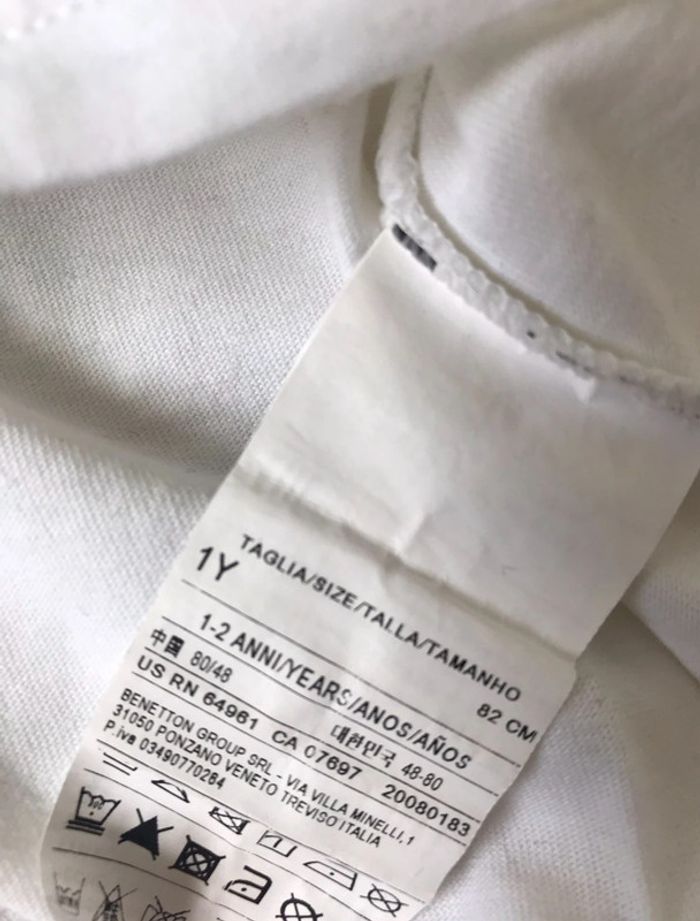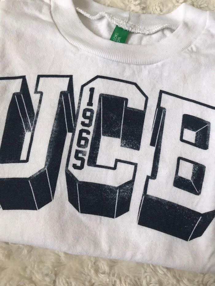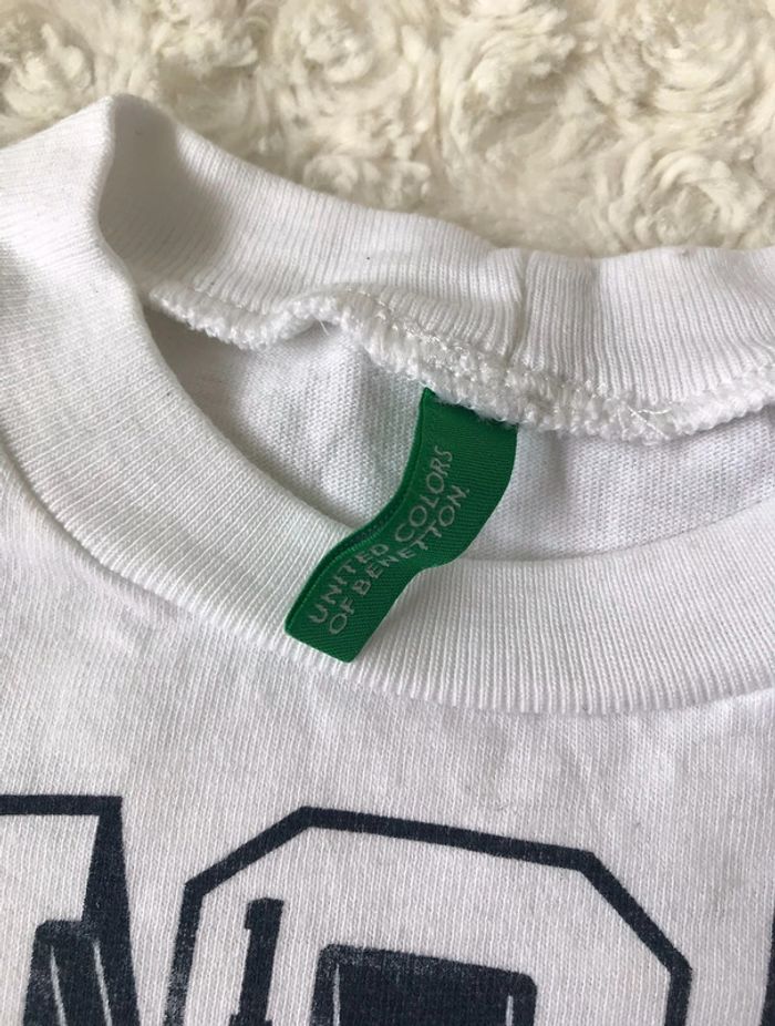 T-shirt United Colors of Benetton en taille 12 mois (mais équivaut à du 18 mois) en très bon état, porté une fois. Effet vieilli sur le flocage fait exprès, voir photo avec l'étiquette quand je venais de l'acheter. #18moismaudoculteur