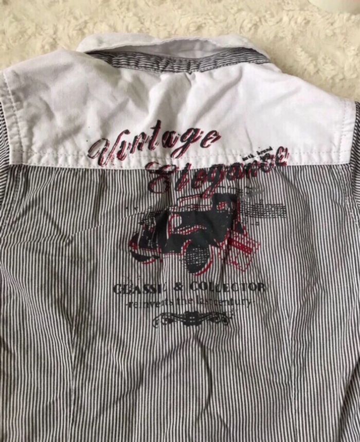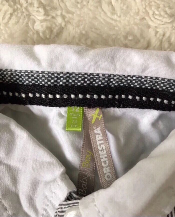 Chemise Orchestra en taille 12 mois en très bon état (juste un léger accident de repassage sur les lettres V et I du mot Vintage à l’arrière mais ça ne choque pas lorsqu’elle est portée). #12moismaudoculteur