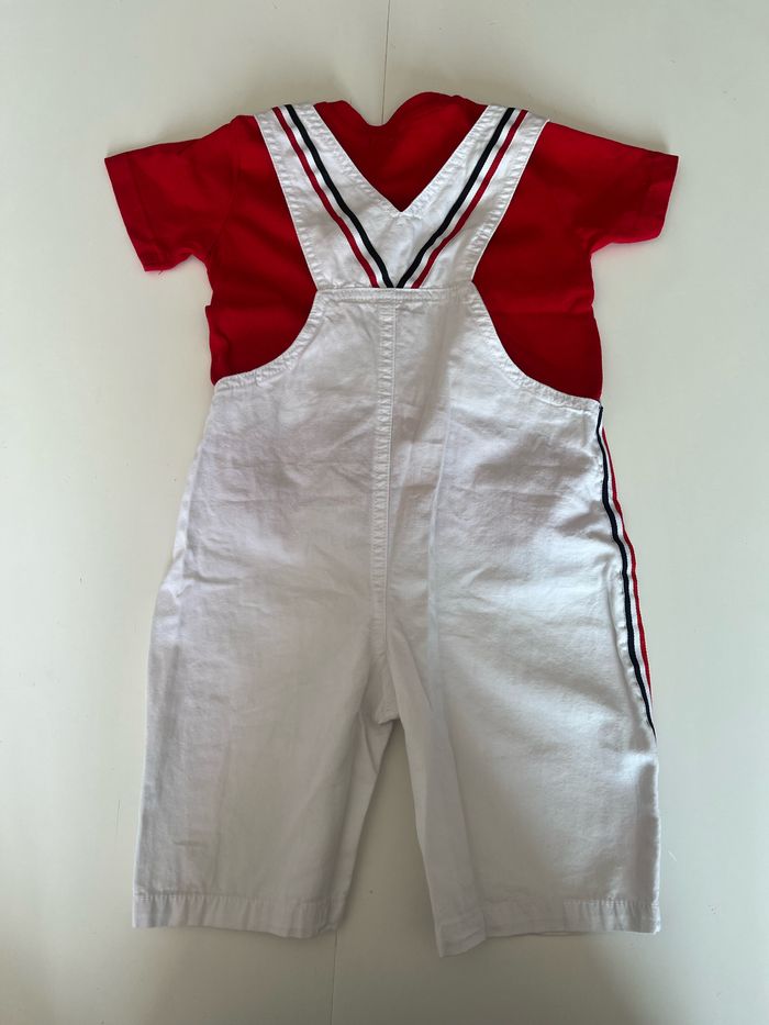 Ensemble t-shirt rouge et salopette blanche. 100% coton. Ouverture par fermeture éclair et pressions à l’entrejambe. Barbouillage by Babou. Taille 86 - 23m. Jamais porté