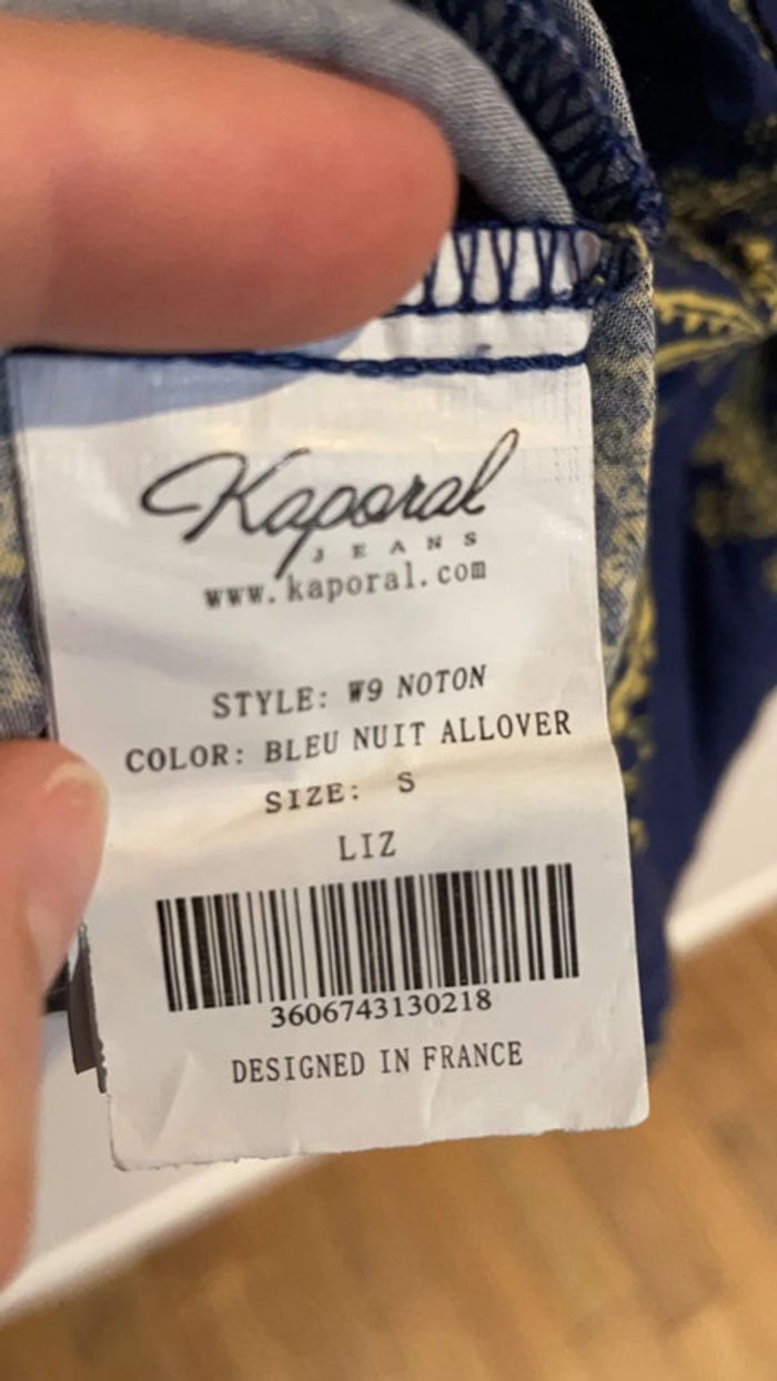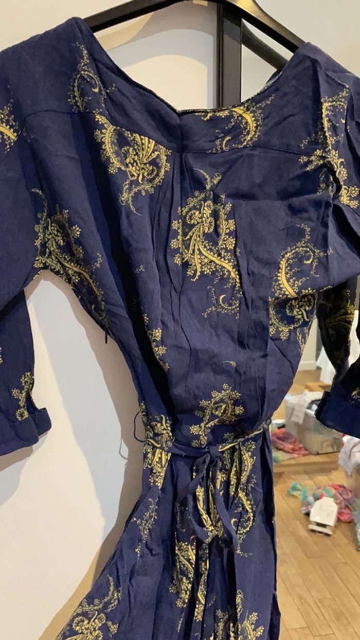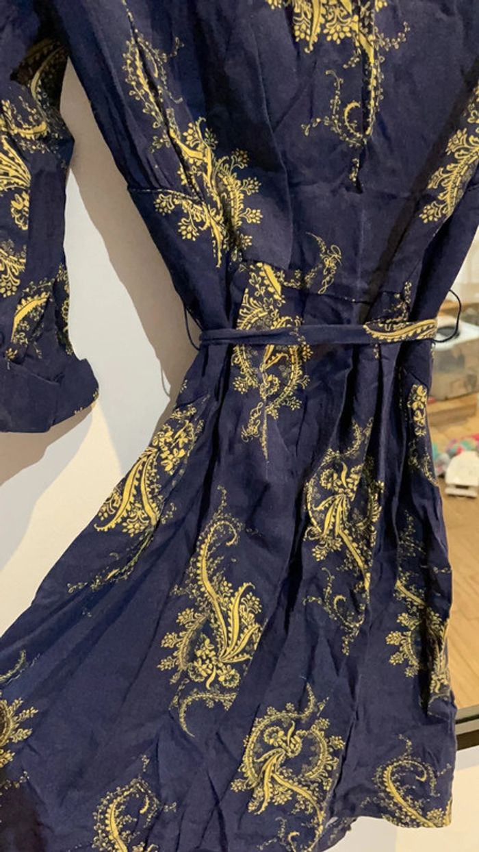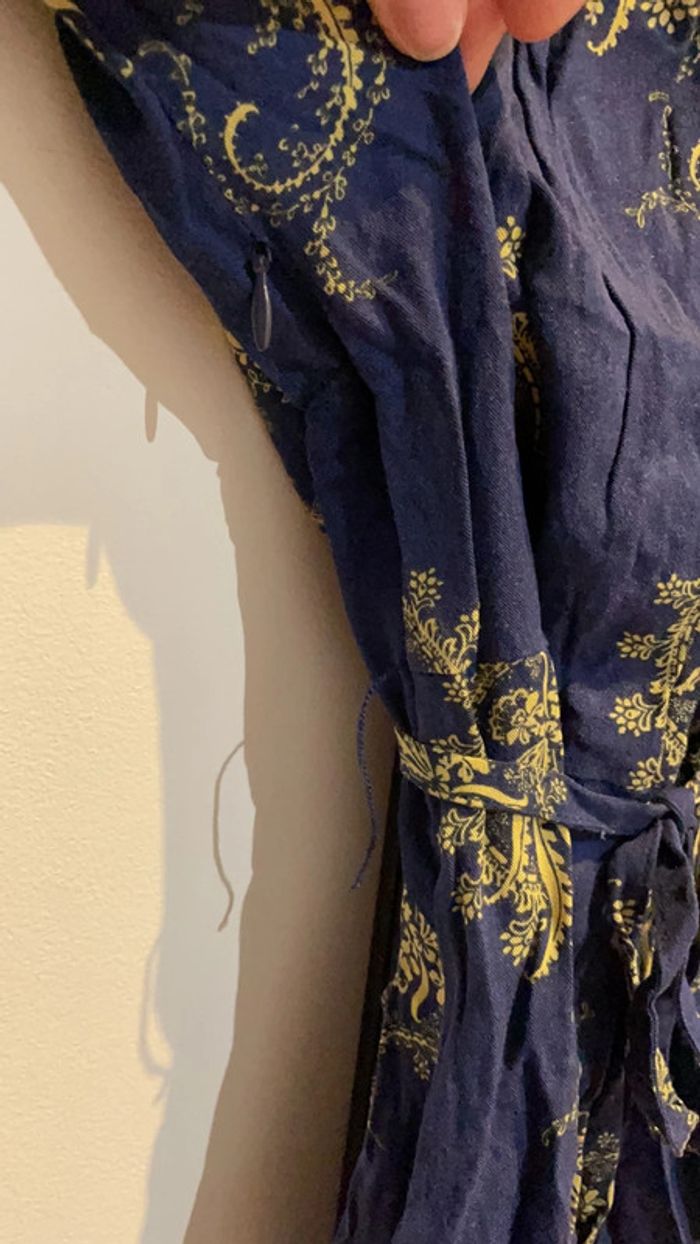 Jolie tunique kaporal avec ceinture et fermeture éclair sur le côté Bleue marine avec motifs jaunes Manches 3/4 Un fil (passage de ceinture) est à recoudre comme vu sur la photo 4 Taille S