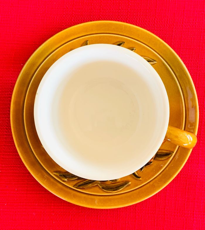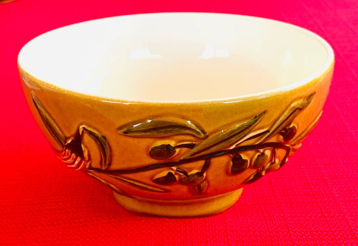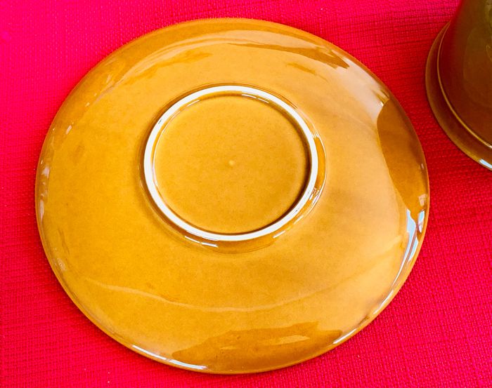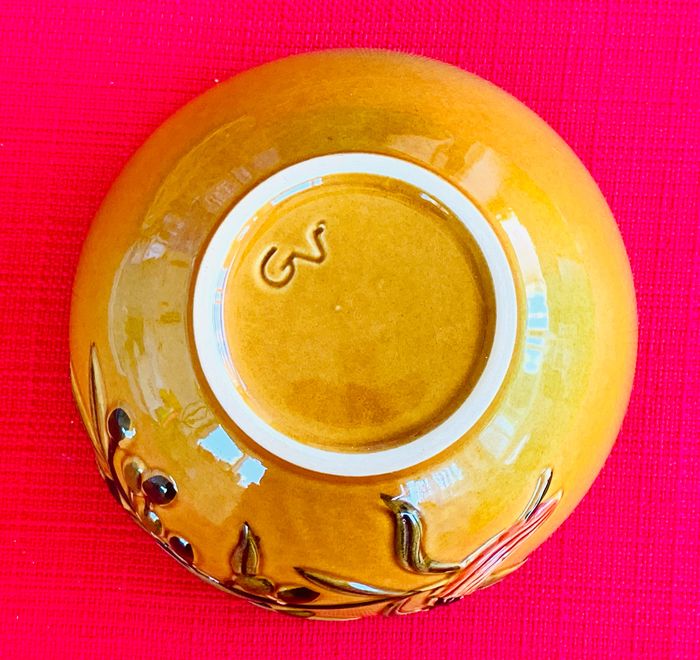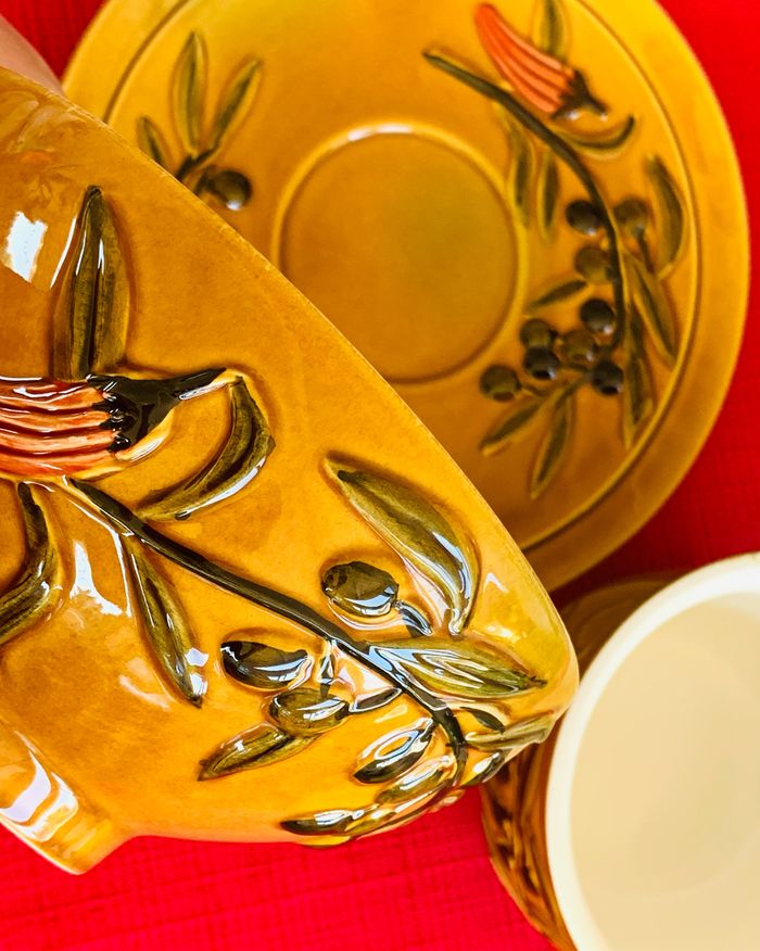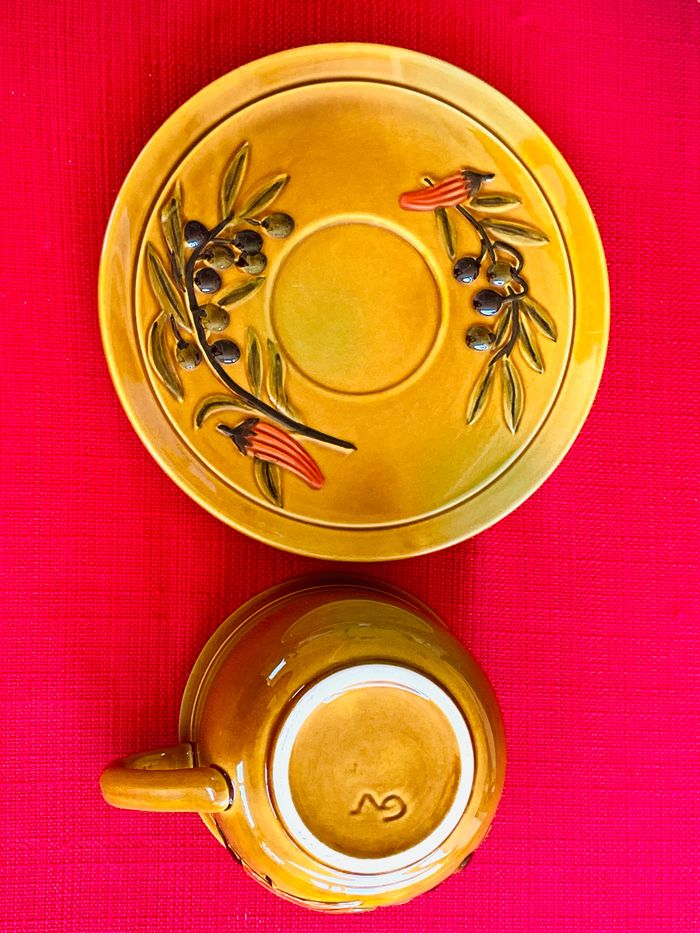 Set style provençal, Tasse, Soucoupe et Bol, couleur moutarde, motifs en relief olives, piments. Gravés "GV" - Tasse diamètre tasse 12,3 cm x hauteur 8,8cm - Soucoupe plat diamètre 20 cm - Bol Diamètre 16cm, diamètre base 7,5cm hauteur 8,5cm ⛔️ Prix FIXES, NON négociables 🚨  👏🏻 Réductions sur les lots 👍🏻 #set #bol #tasse #olives #cc_divers
