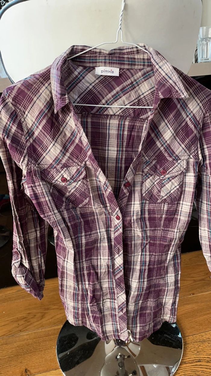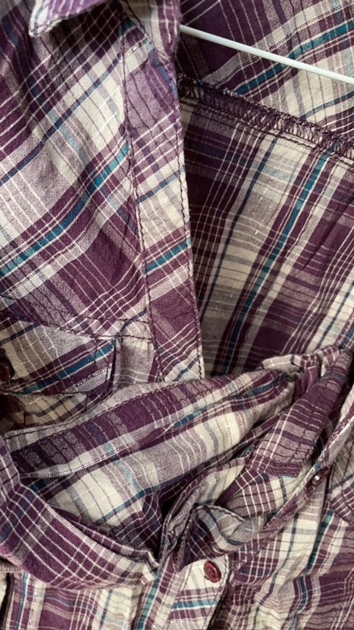 Chemisier à carreaux violet et gris avec fils argentés Possibilité de remonter les manches au 3/4 avec un bouton au niveau du coude Très bon état Taille 36