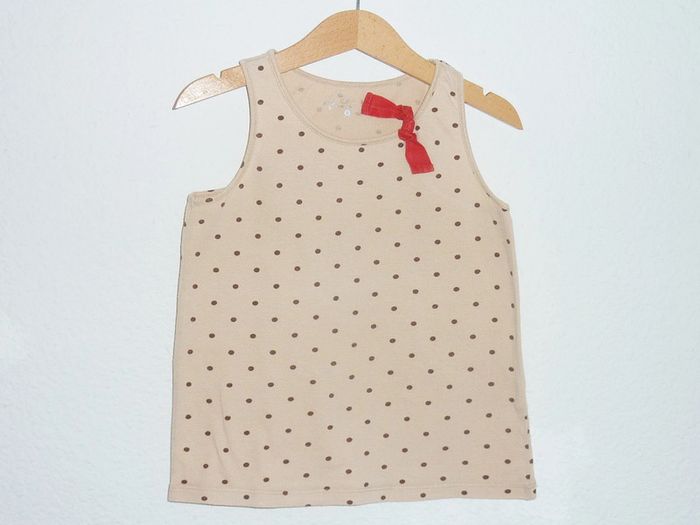 Pour voir mes annonces dans cette taille, tapez #karinelillefille6ans Faites des lots 🌿 Débardeur cfk en très bon état, imprimé à pois marrons sur fond beige orné d'un noeud rouge